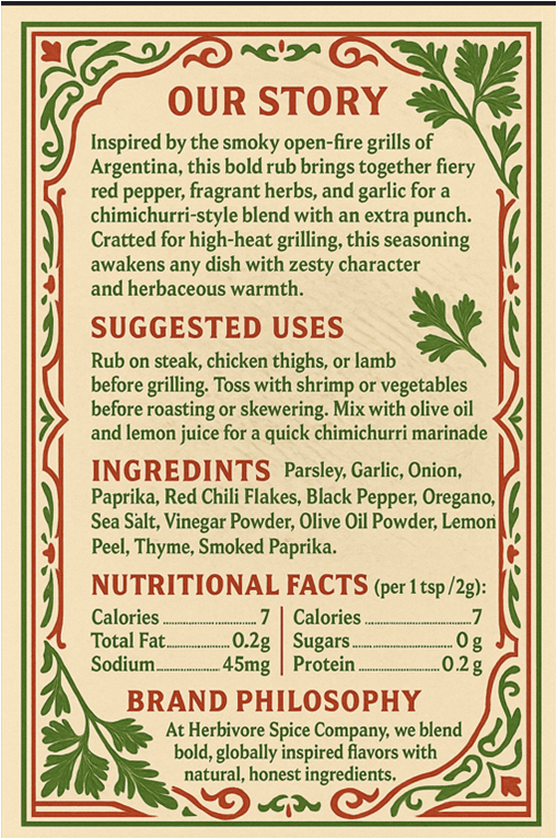 At Herbivore Spice Company, we blend bold, globally inspired flavors with natural, honest ingredients. Our small-batch spices reflect the spirit of open-fire cooking and handcrafted traditions. No fillers, no shortcuts—just pure flavor made for the modern grill.